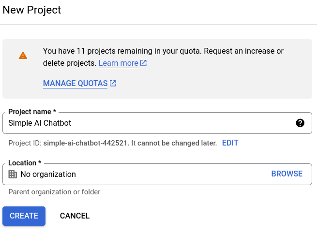 The project ID shown above is a random one generated by Google Cloud because the name I chose, demo-image-generation, was already in use.